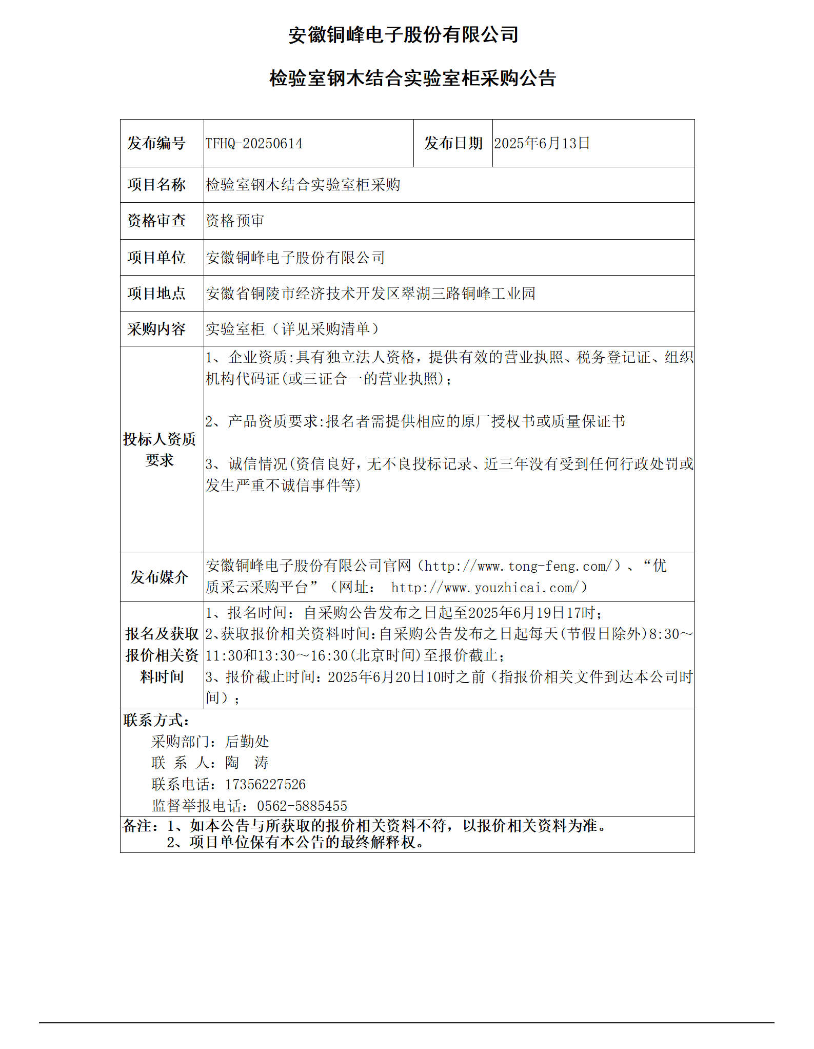 安徽銅峰電子股份有限公司 (檢驗室鋼木結(jié)合實驗室柜采購公告)_01