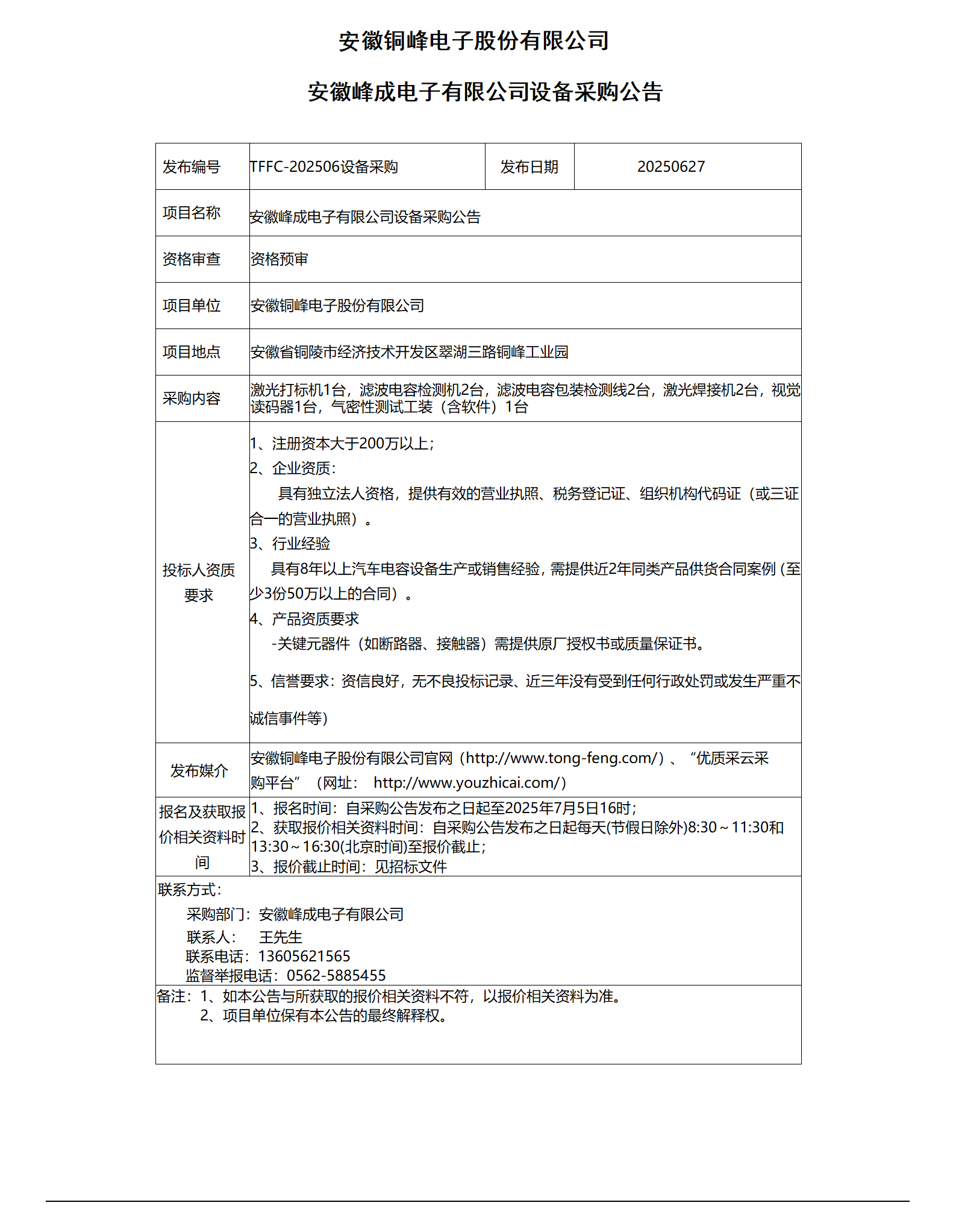 安徽峰成電子有限公司設(shè)備采購(gòu)公告_01